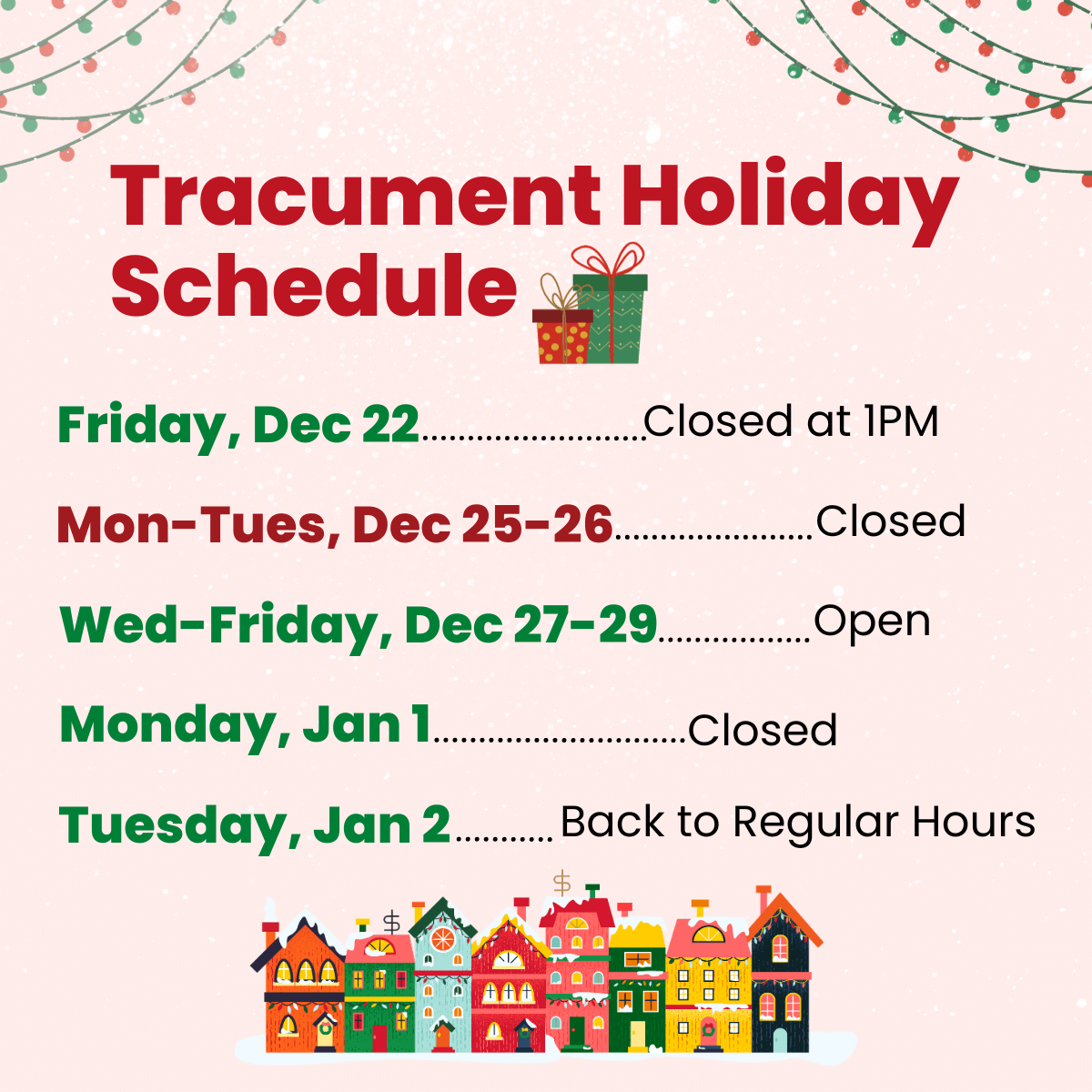 We hope you have all your gifts wrapped and winter recipes ready to go so that you can relax with family, friends, and loved ones over the next couple of weeks. To that end, here is Tracument's holiday schedule: