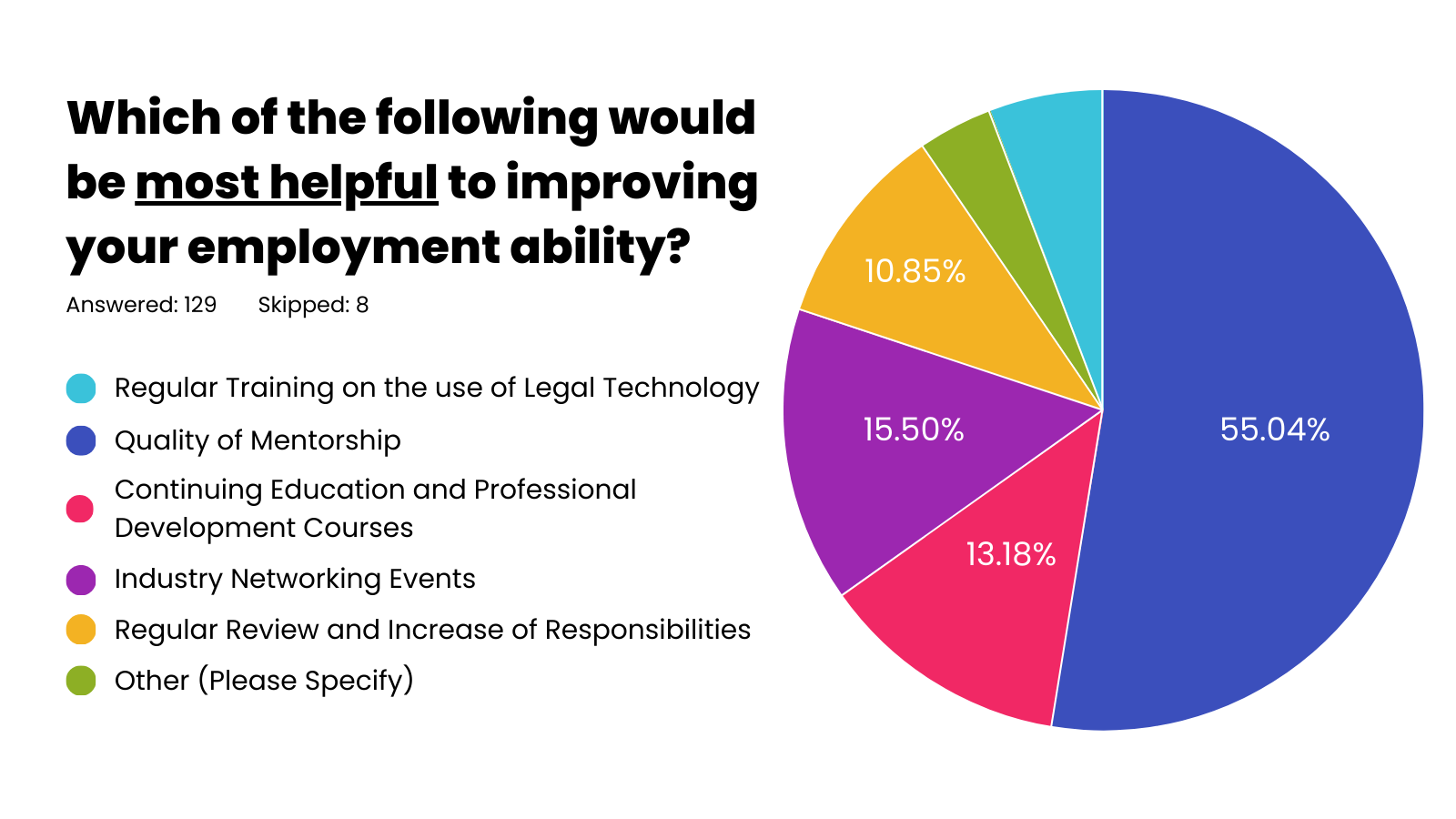 In our 2022 Legal Survey, approximately 55% of legal professionals say that increasing training and mentorship are crucial to a firm's overall success. While more senior legal professionals may believe that junior lawyers and law students may value flexibility and remote work more, we find that, in our junior survey [link to lead magnet if it's available], mentorship usually ranks higher. We asked students what would be important to them when considering future employment opportunities. We found that 55% of law students prioritize quality mentorship as the most beneficial factor for enhancing their employability, even more than networking or regular evaluations. Additionally, 41% of young legal professionals in our survey emphasize the importance of mentors' presence and quality when evaluating future employment prospects, ranking it above work flexibility which was at 25.9%.